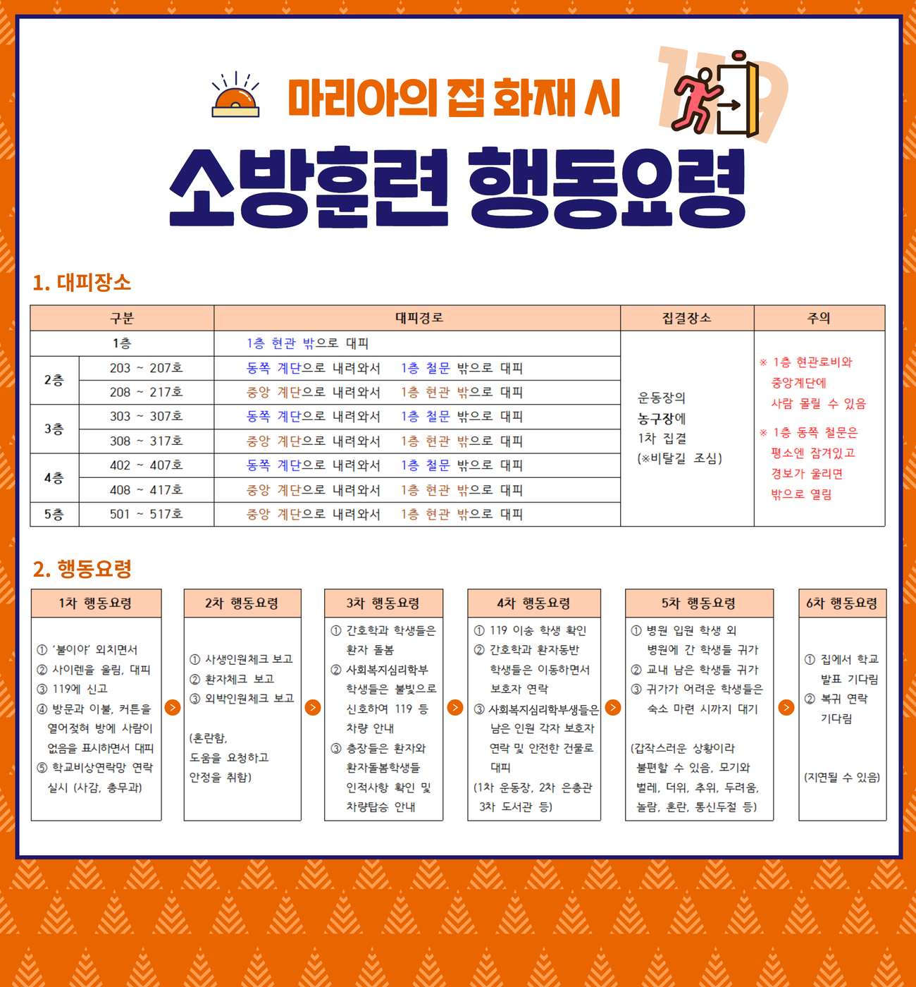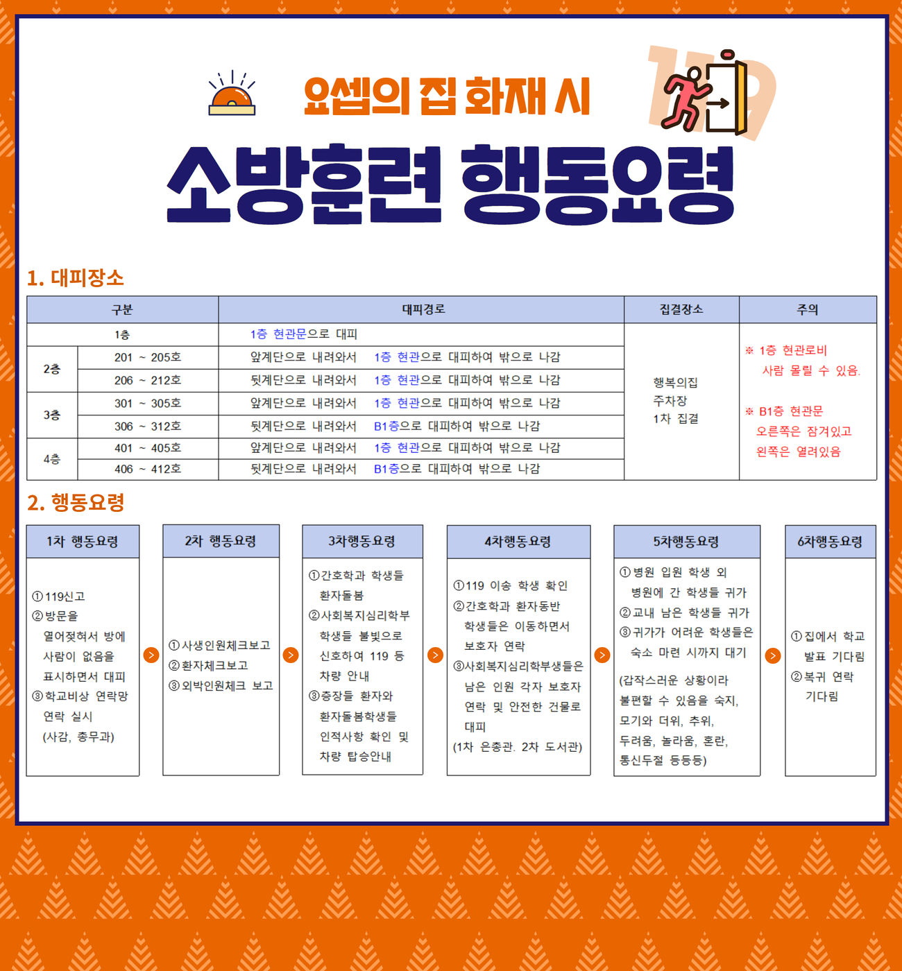 7) “불이야” 소리부터 행복의집 주차장에서 인원체크까지 최소한의 시간으로 대피합니다.